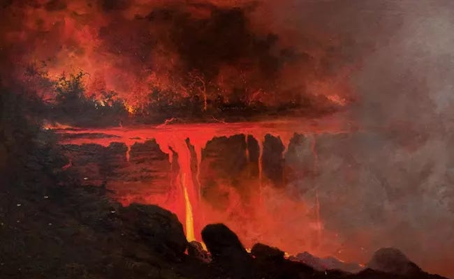 In the late 19th century, a number of painters were fascinated by the active volcanoes of the Hawaiian islands. These became so popular as subjects that the artists were collectively dubbed the “Volcano School.”